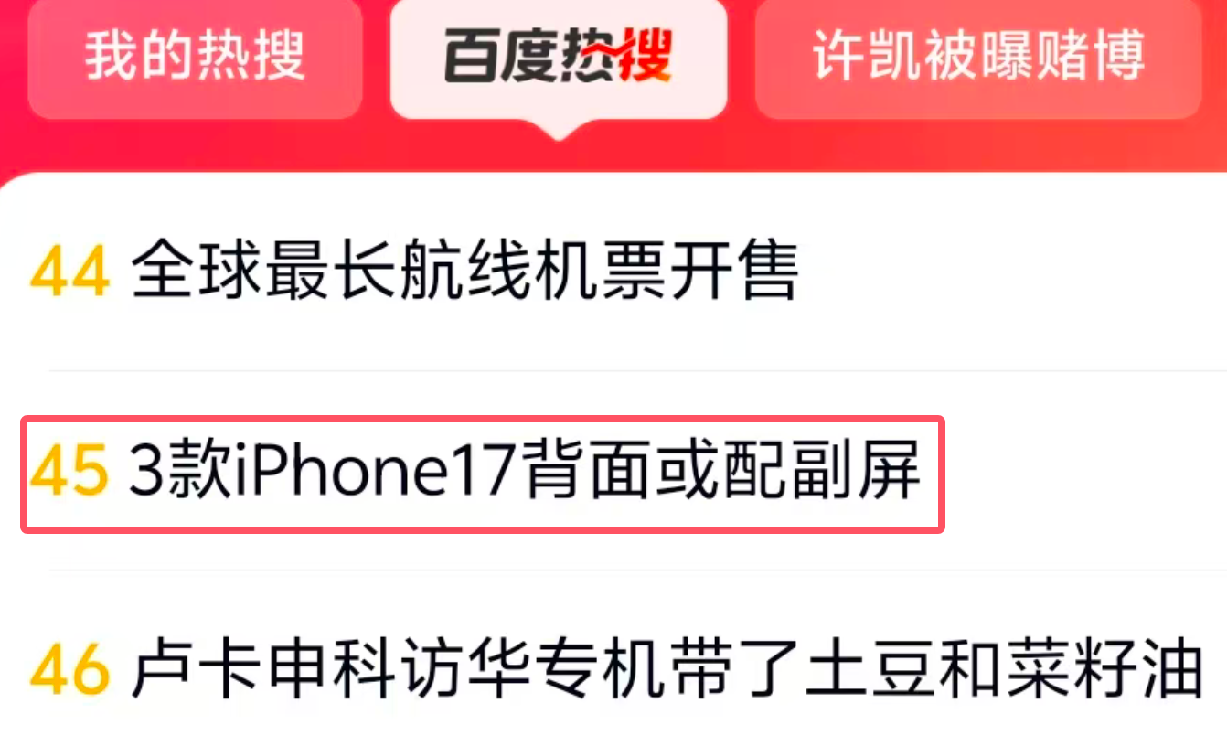 “3款iPhone 17背面或配副屏”沖上百度熱搜
