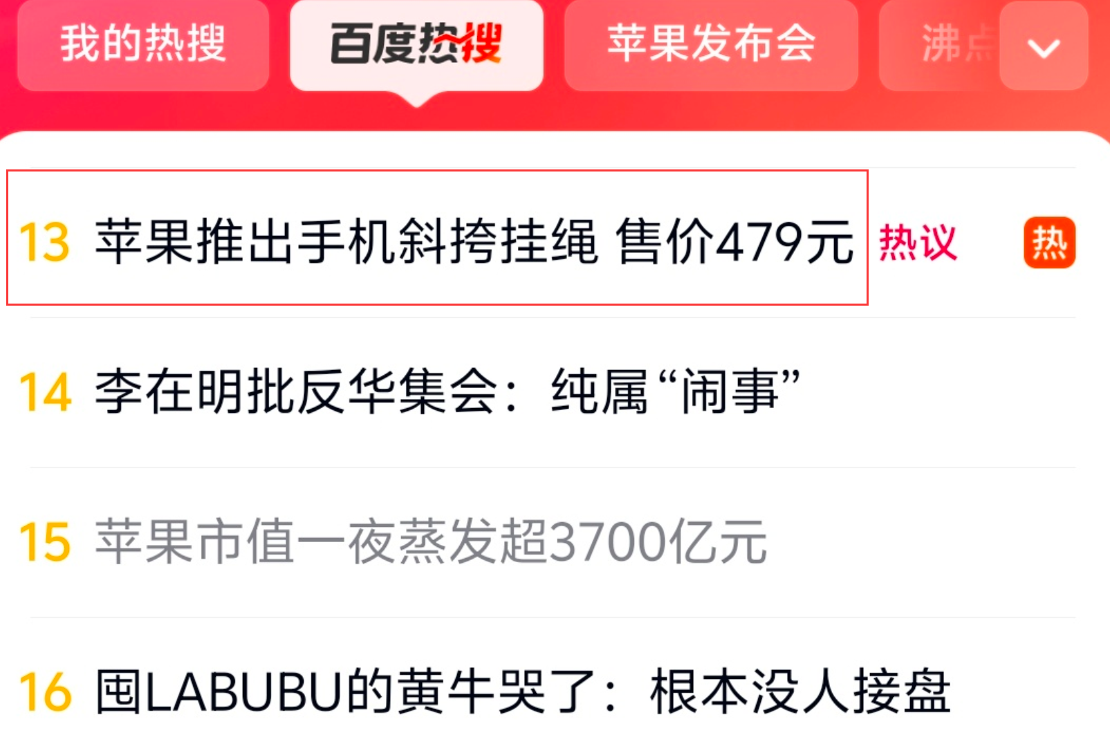 “蘋果推出手機斜挎掛繩 售價479元”沖上百度熱搜 網友:智商稅