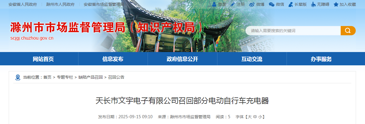 家電消費(fèi)網(wǎng)9月19日訊 昨天,安徽省文宇電子有限公司按照《消費(fèi)品召回管理暫行規(guī)定》的要求,向安徽省市場(chǎng)監(jiān)督管理局、滁州市市場(chǎng)監(jiān)督管理局報(bào)告了召回計(jì)劃,將自即日起,召回2023年6月12日生產(chǎn)的電動(dòng)自行車充電器(規(guī)格型號(hào)48V20Ah),涉及數(shù)量為1600只。