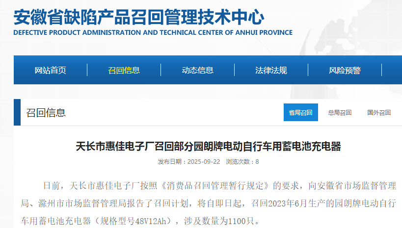 家電消費網9月25日訊 昨天,安徽省惠佳電子廠按照《消費品召回管理暫行規定》的要求,向安徽省市場監督管理局、滁州市市場監督管理局報告了召回計劃,將自即日起,召回2023年6月生產的園朗牌電動自行車用蓄電池充電器(規格型號48V12Ah),涉及數量為1100只。