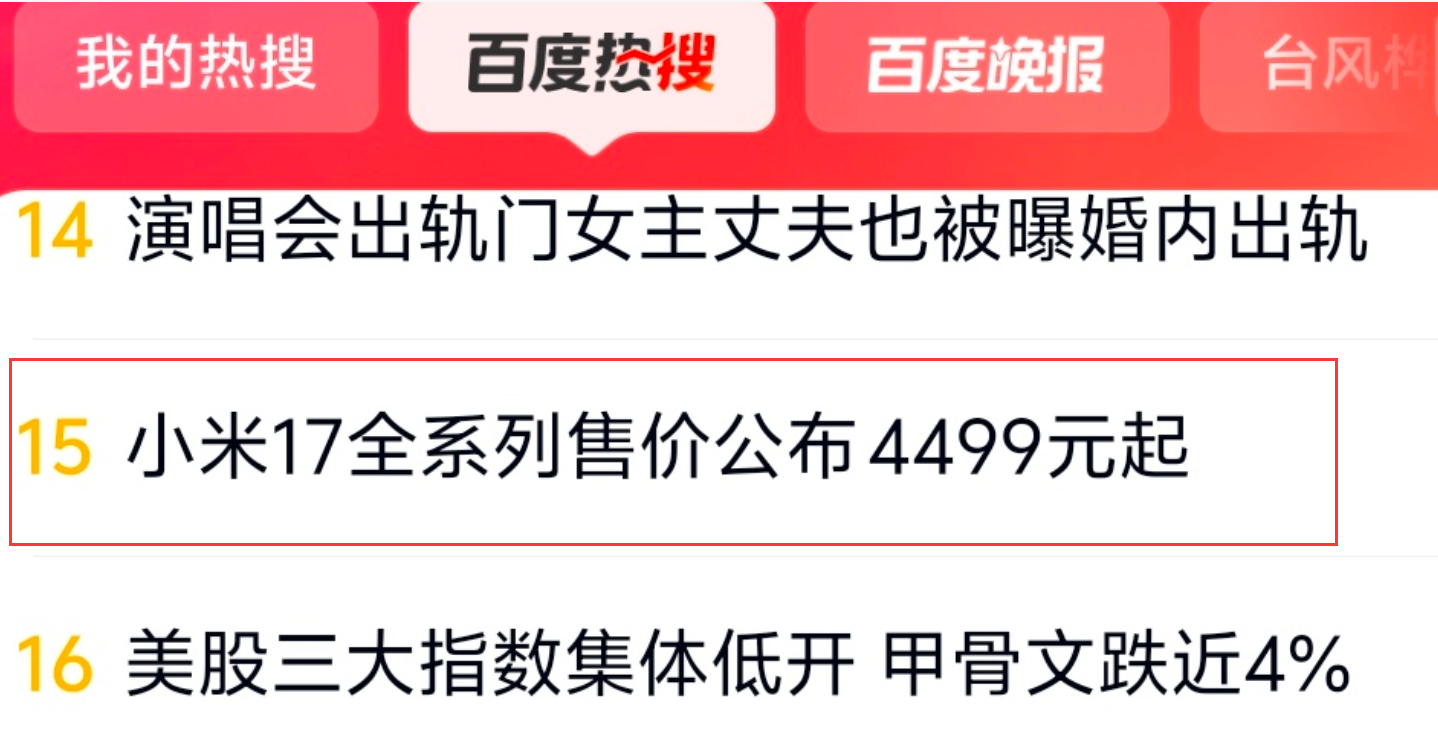 “小米17全系列售價公布 4499元起”沖上百度熱搜 網友:支持國產