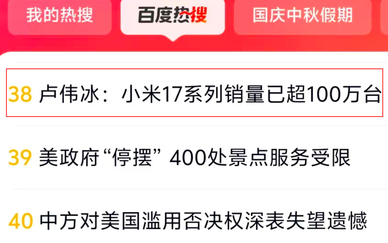 “盧偉冰:小米17系列銷量已超100萬臺(tái)”沖上百度熱搜