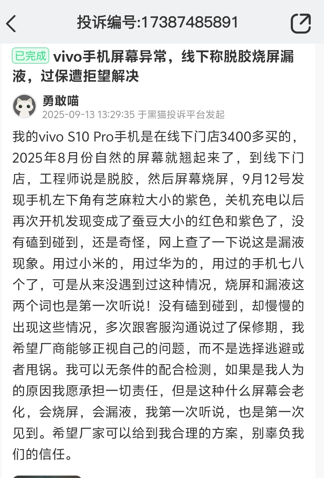 導讀: 家電消費網10月10日訊 昨天,有消費者投訴稱,其花費3400多元購買的vivo S10 Pro手機在今年8月屏幕突然翹起來。vivo門店人員說是脫膠。 然后又發現屏幕燒屏。9月12日又發現手機左下角有芝麻粒大小的紅
