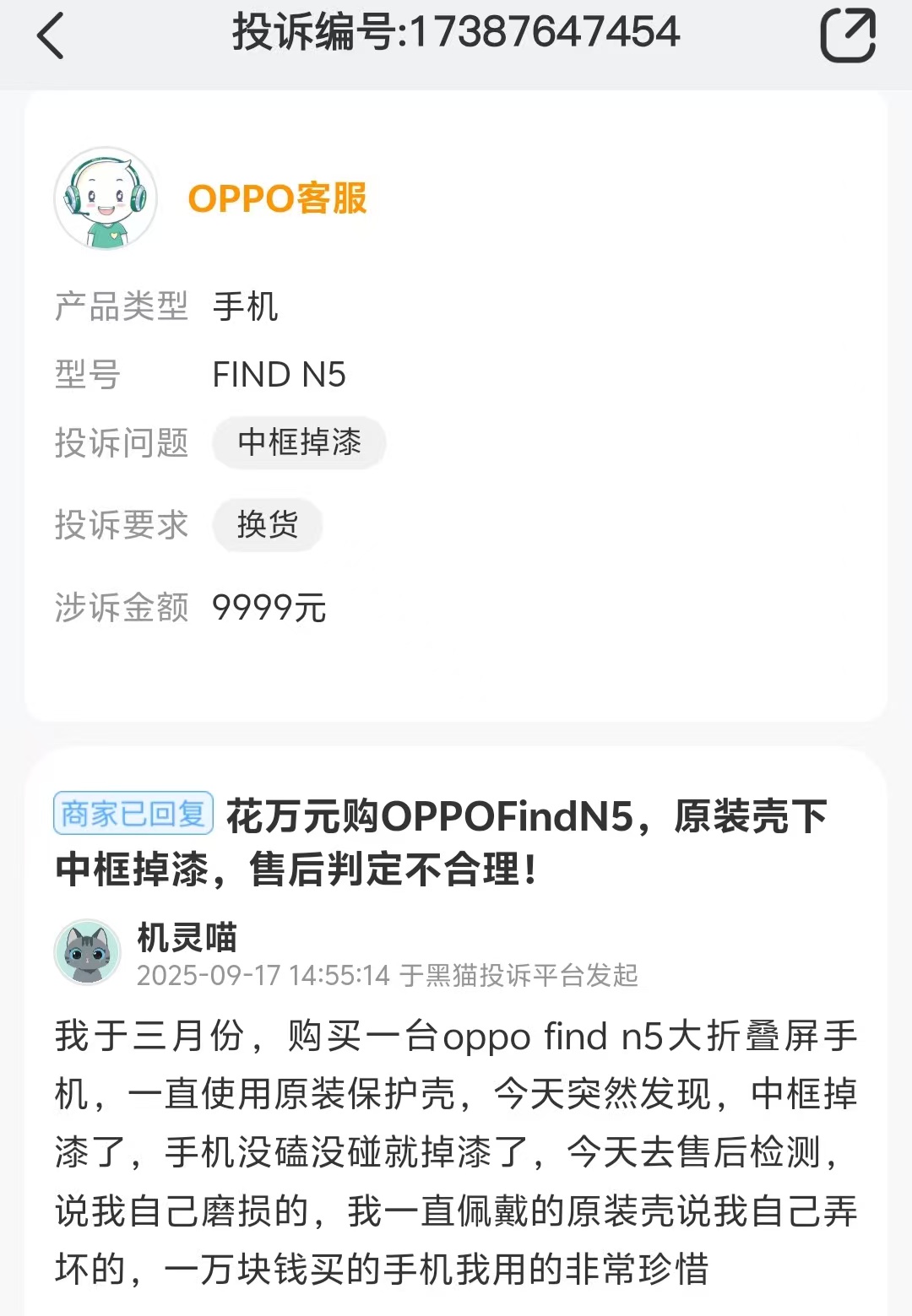 家電消費網(wǎng)10月10日訊 昨天,有消費者投訴稱,其于今年三月花費萬元購買的OPPO find N5大折疊屏手機,突然中框掉漆,OPPO售后以消費者人為造成為由,拒絕換貨。