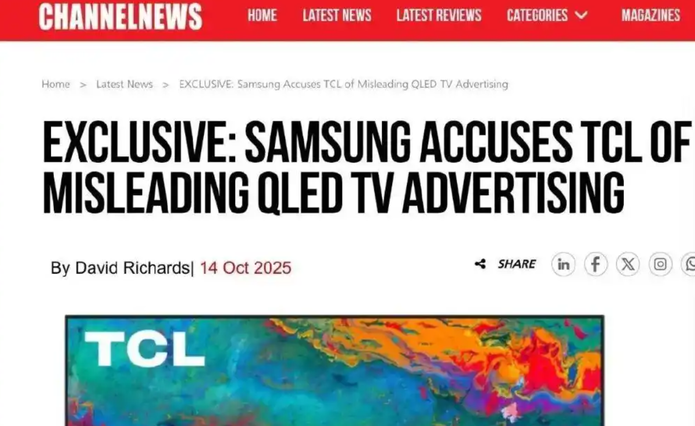 澳大利亞報(bào)紙Channelnews報(bào)道稱,根據(jù)三星的投訴,TCL在其C655與C745等機(jī)型的宣傳中涉嫌“虛假和誤導(dǎo)性宣傳”,夸大或誤導(dǎo)性地宣稱使用了“量子點(diǎn)QLED”技術(shù),特別是在關(guān)于量子點(diǎn)技術(shù)如何提升色彩精度、亮度和畫質(zhì)的表現(xiàn)上。為此,三星電子出具了具體數(shù)值(如覆蓋DCI-P3百分比、ΔE色差等)作為證據(jù)。