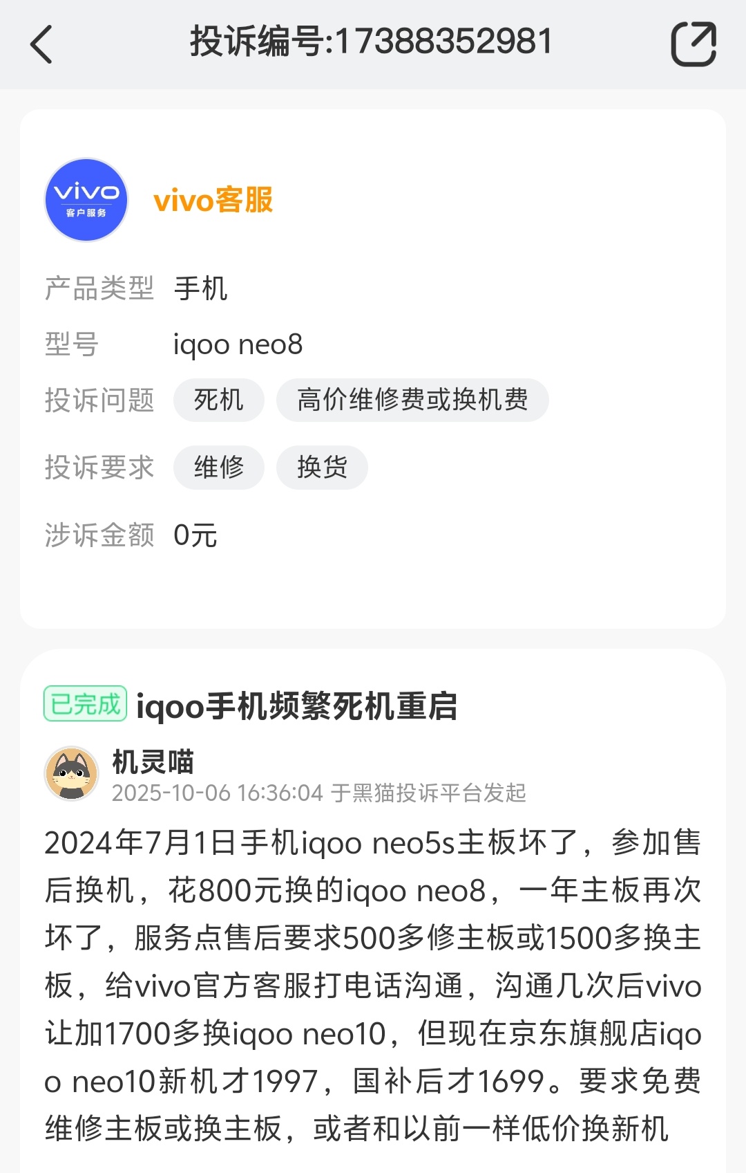 家電消費網11月2日訊 昨天,有消費者投訴稱,其于2024年7月1日購買的iqoo neo5s手機主板壞了,vivo售后讓再花800元換了iqoo neo8。沒想到,iqoo neo8使用一年主板也壞了,服務點售后要求該消費者再交500多元修主板或再交1500多元換主板。和vivo官方客服打電話溝通,最終給出的解決方案是vivo讓加1700多元換iqoo neo10。