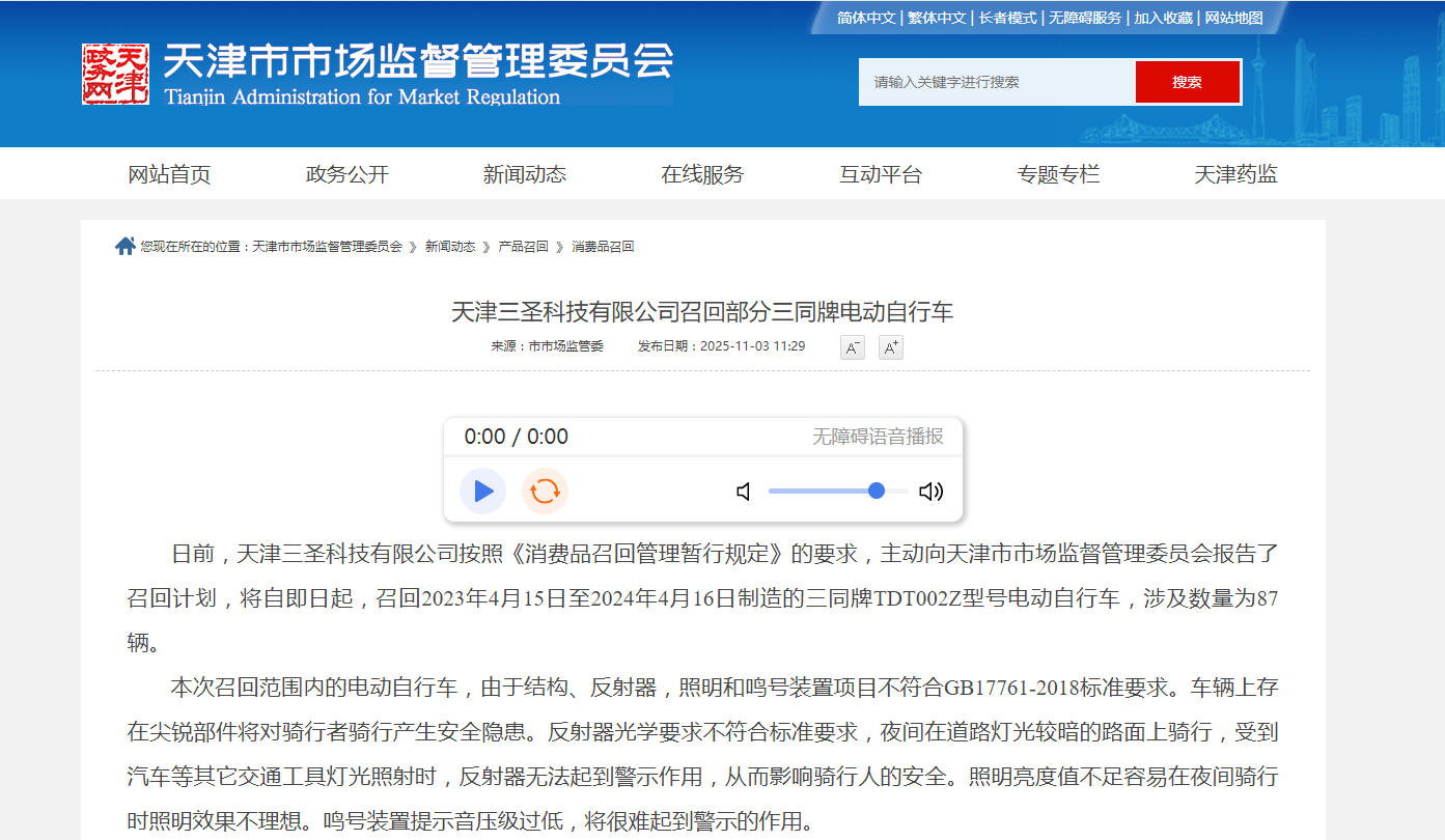 家電消費網11月5日訊 昨天,天津三圣科技有限公司按照《消費品召回管理暫行規定》的要求,主動向天津市市場監督管理委員會報告了召回計劃,將自即日起,召回2023年4月15日至2024年4月16日制造的三同牌TDT002Z型號電動自行車,涉及數量為87輛。