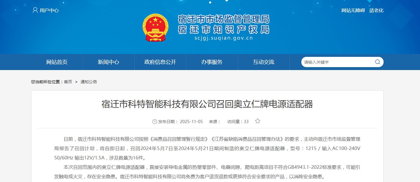家電消費網11月6日訊 昨天,江蘇宿遷市科特智能科技有限公司按照《消費品召回管理暫行規定》《江蘇省缺陷消費品召回管理辦法》的要求,主動向宿遷市市場監督管理局報告了召回計劃,將自即日起,召回2024年5月7日至2024年5月21日期間制造的奧立仁牌電源適配器,型號:1215/輸入AC100-240V 50/60Hz輸出12V/1.5A,涉及數量為16件。