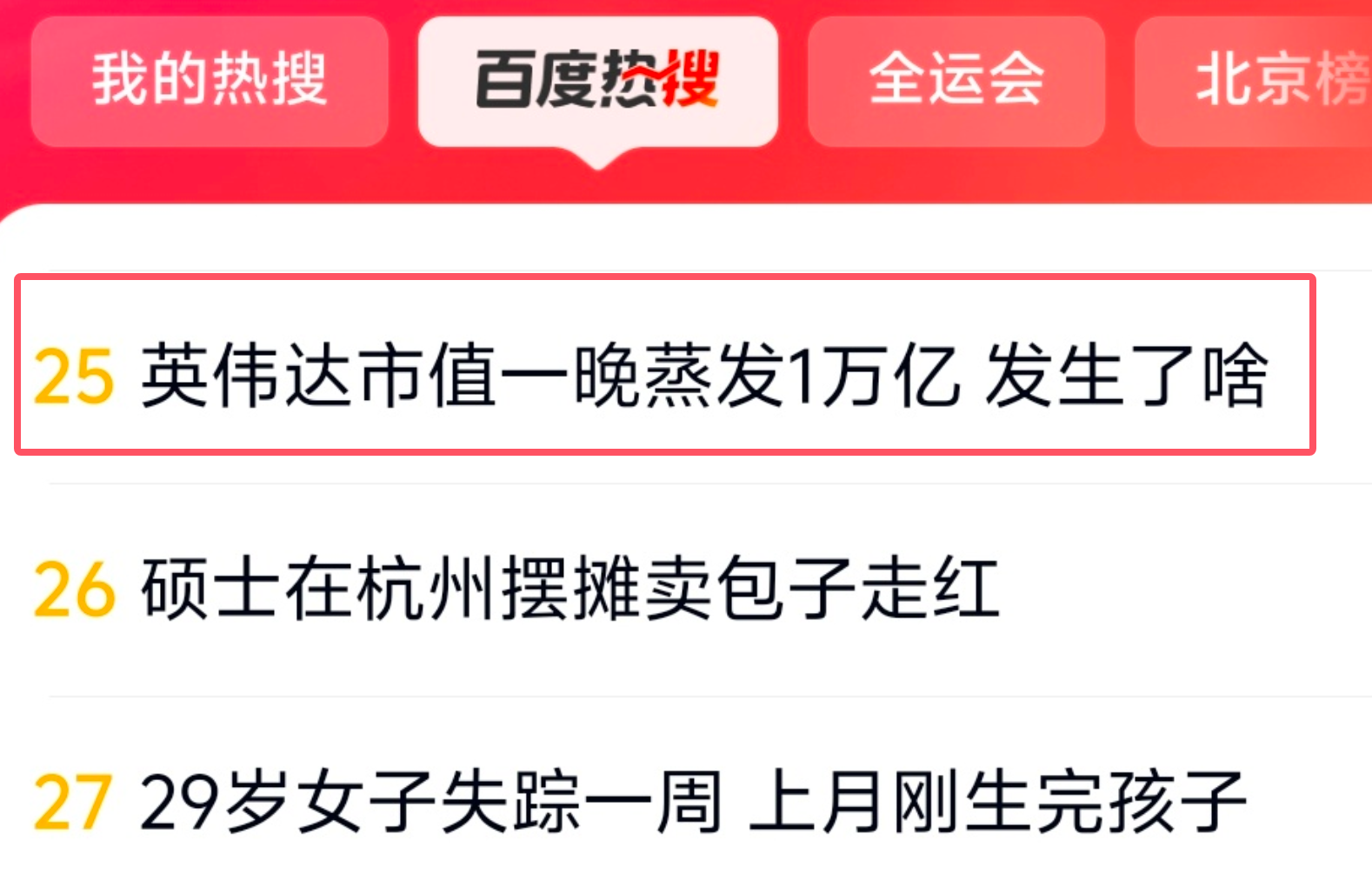 “英偉達市值一晚蒸發1萬億 發生了啥”沖上百度熱搜