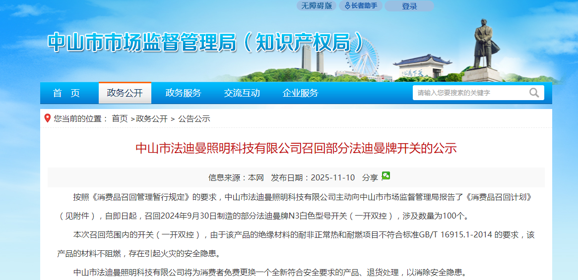 家電消費網11月13日訊 昨天,廣東省中山市法迪曼照明科技有限公司主動向中山市市場監督管理局報告了《消費品召回計劃》(見附件),自即日起,召回2024年9月30日制造的部分法迪曼牌N3白色型號開關(一開雙控),涉及數量為100個。