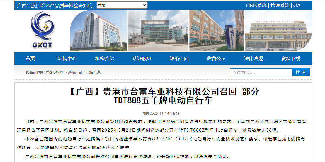 家電消費網(wǎng)11月19日訊 昨天,廣西貴港市臺富車業(yè)科技有限公司受缺陷調(diào)查影響,按照《消費品召回管理暫行規(guī)定》的要求,主動向廣西壯族自治區(qū)市場監(jiān)督管理局報告了召回計劃。將自即日起,召回2025年3月23日期間制造的部分五羊牌TDT888Z型號電動自行車,涉及數(shù)量為38輛。