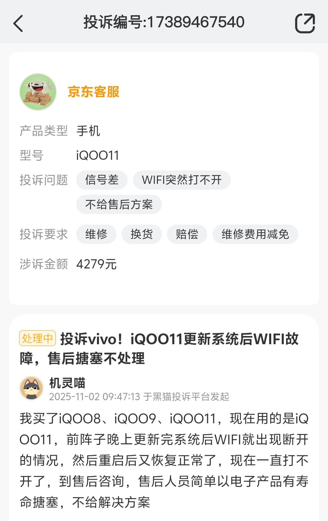 導讀: 家電消費網11月21日訊 昨天,有消費者投訴稱,其是iqoo智能手機的粉絲。購買過iQOO8、iQOO9、iQOO11。現在用的是花了4279元購買的iQOO11,但前不久前更新完系統(tǒng)后WIFI就出現斷開的情況,重啟后恢復正常,現...