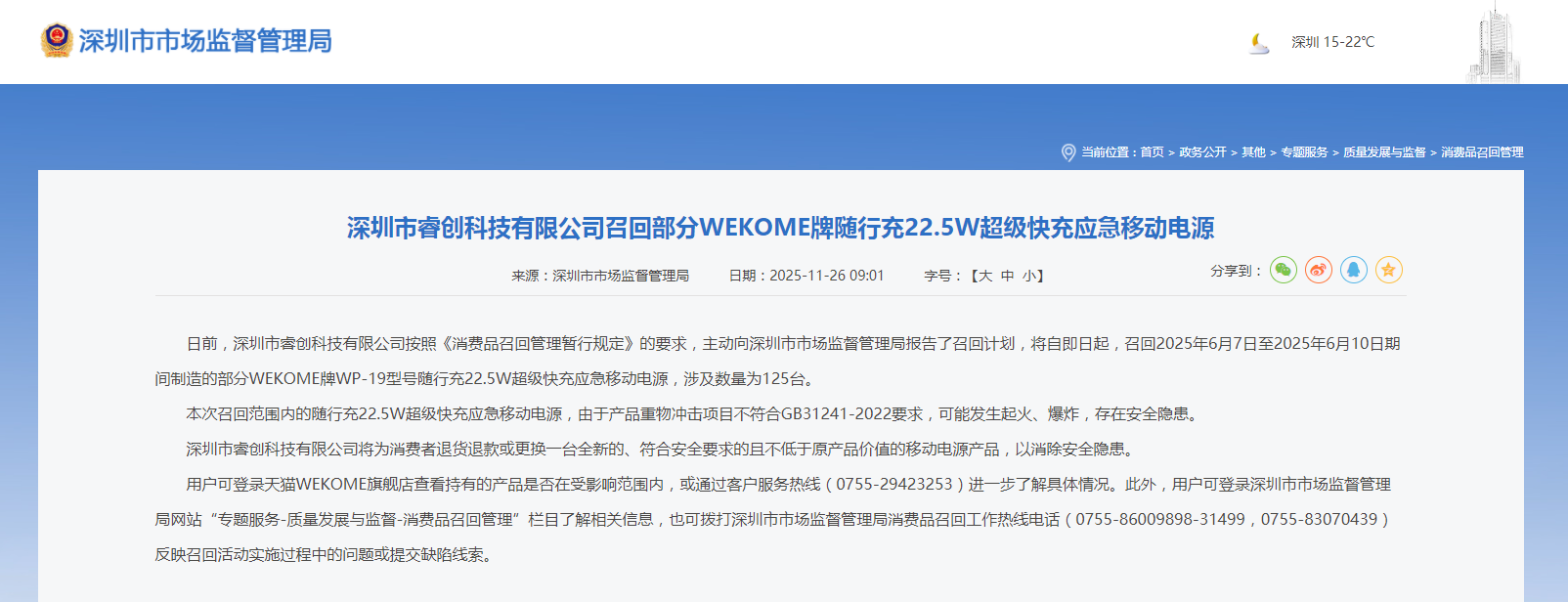 家電消費網11月26日訊 昨天,深圳市睿創科技有限公司按照《消費品召回管理暫行規定》的要求,主動向深圳市市場監督管理局報告了召回計劃,將自即日起,召回2025年6月7日至2025年6月10日期間制造的部分WEKOME牌WP-19型號隨行充22.5W超級快充應急移動電源,涉及數量為125臺。