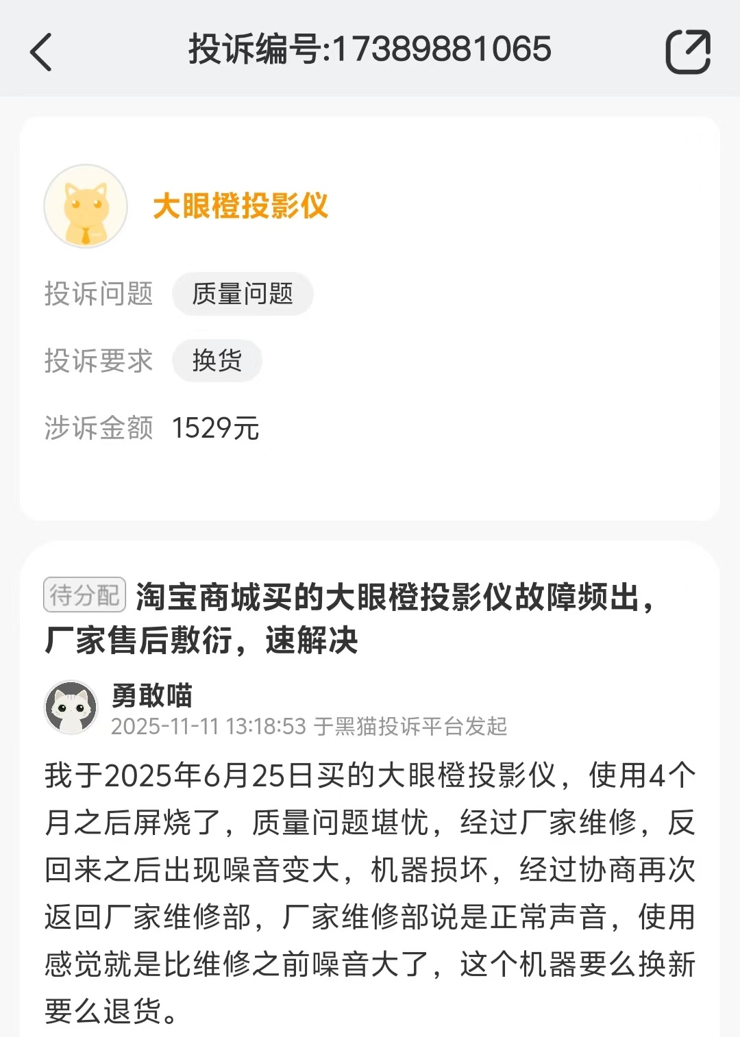 大眼橙投影儀質(zhì)量問(wèn)題維修后噪音變大 售后敷衍遭投訴