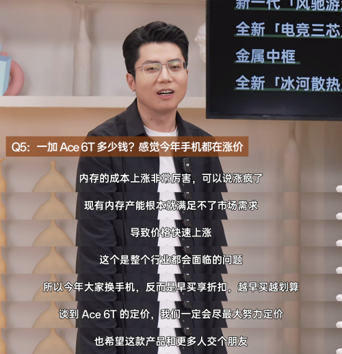 針對網(wǎng)友問“內(nèi)存漲價是否影響售價?”,李杰坦言,因?yàn)楝F(xiàn)有內(nèi)存產(chǎn)能滿足不了市場需求,導(dǎo)致價格快速上漲。建議用戶“早買享折扣”,同時承諾一加將竭盡所能定價,與更多人交朋友。