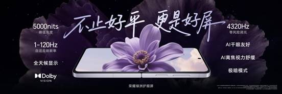 榮耀Magic V Flip2的內外屏素質延續旗艦級表現。6.82英寸榮耀綠洲護眼內屏,峰值亮度5000nits,支持4320Hz零風險調光;4.0英寸榮耀綠洲護眼外屏,峰值亮度3600nits,支持3840Hz零風險調光。內外屏均支持LTPO 2.0自適應刷新,同時搭載AI離焦視力舒緩、AI干眼友好、極暗模式等護眼功能,為用戶不同場景的用眼提供全面守護。