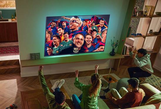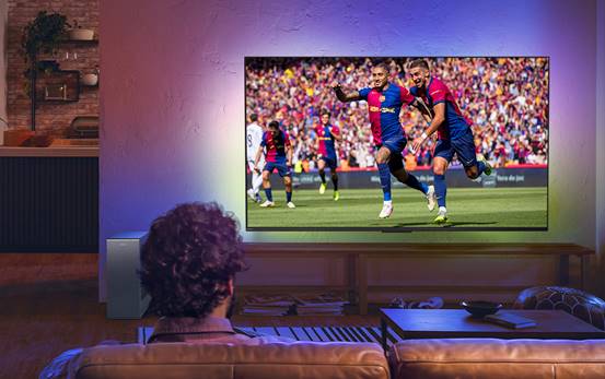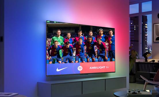 飛利浦環景光電視為巴薩的每一場勝利加冕。其擁有荷蘭皇家飛利浦環景光專利技術,令電視圖像色彩以光影溢出屏幕,通過屏幕后的智能LED燈泡,實時將屏幕畫面以光影投射到背景,營造“光隨影動”、“光隨聲動”、“藝術壁畫”等炫彩環境,讓球迷沉浸式感受比賽的精彩與奪冠的喜悅。