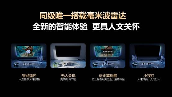 D7H Ultra創新搭載毫米波雷達,為用戶帶來四大全新的使用體驗:智能播控,實現人走即停,人來即播;無人關機,離開后自動關機,讓觀影更加節能;近距離提醒,防止兒童近距離觀看,避免傷眼,有效保護視力;更有貼心的小夜燈功能,做到人來燈亮,人走燈滅,讓電視的智能體驗貫穿觀影的各個方面。