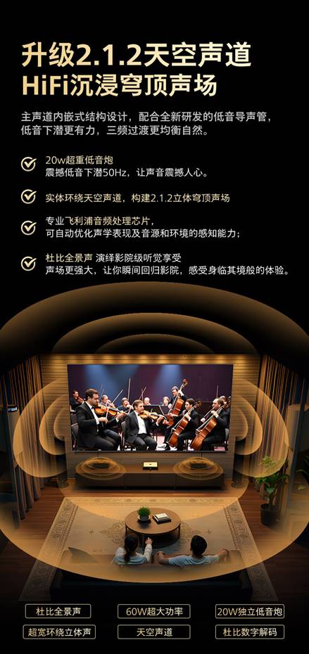 極致的觀影體驗離不開“聲”“畫”雙絕,飛利浦100MLED901在視覺拉滿的同時,升級帶來2.1.2天空聲道架構,打破傳統電視的平面音效局限,為用戶帶來全方位包裹的立體聽覺盛宴。