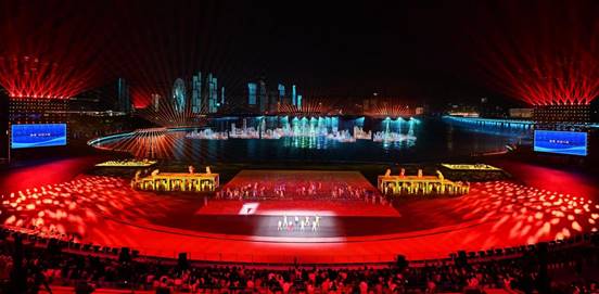 舞臺最大的亮點之一,就是創新性地將陸域看臺、水域舞臺與城市背景融為一體,打造出名副其實的“城市全景閉幕式”。而燈光則成為串聯這一切的“點睛之筆”,它將不同元素巧妙結合,最終構成了這場震撼全場的視覺盛宴。