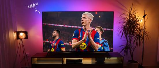 比賽開場僅數分鐘,費蘭接隊友傳球冷靜推射破門,巴薩的紅色戰袍在球場燈光下格外耀眼。此刻,飛利浦環景光電視的智能LED燈帶同步亮起光影,從屏幕邊緣自然延伸至墻面,瞬間讓客廳被紅藍激情包裹。這種“畫面越熱烈,氛圍越沉浸”的體驗,正是環景光技術的魅力,它打破屏幕與環境的界限,讓進球瞬間的情緒不再局限于方寸屏幕,而是彌漫在客廳的每個角落,讓你與巴薩的勝利同頻共振。