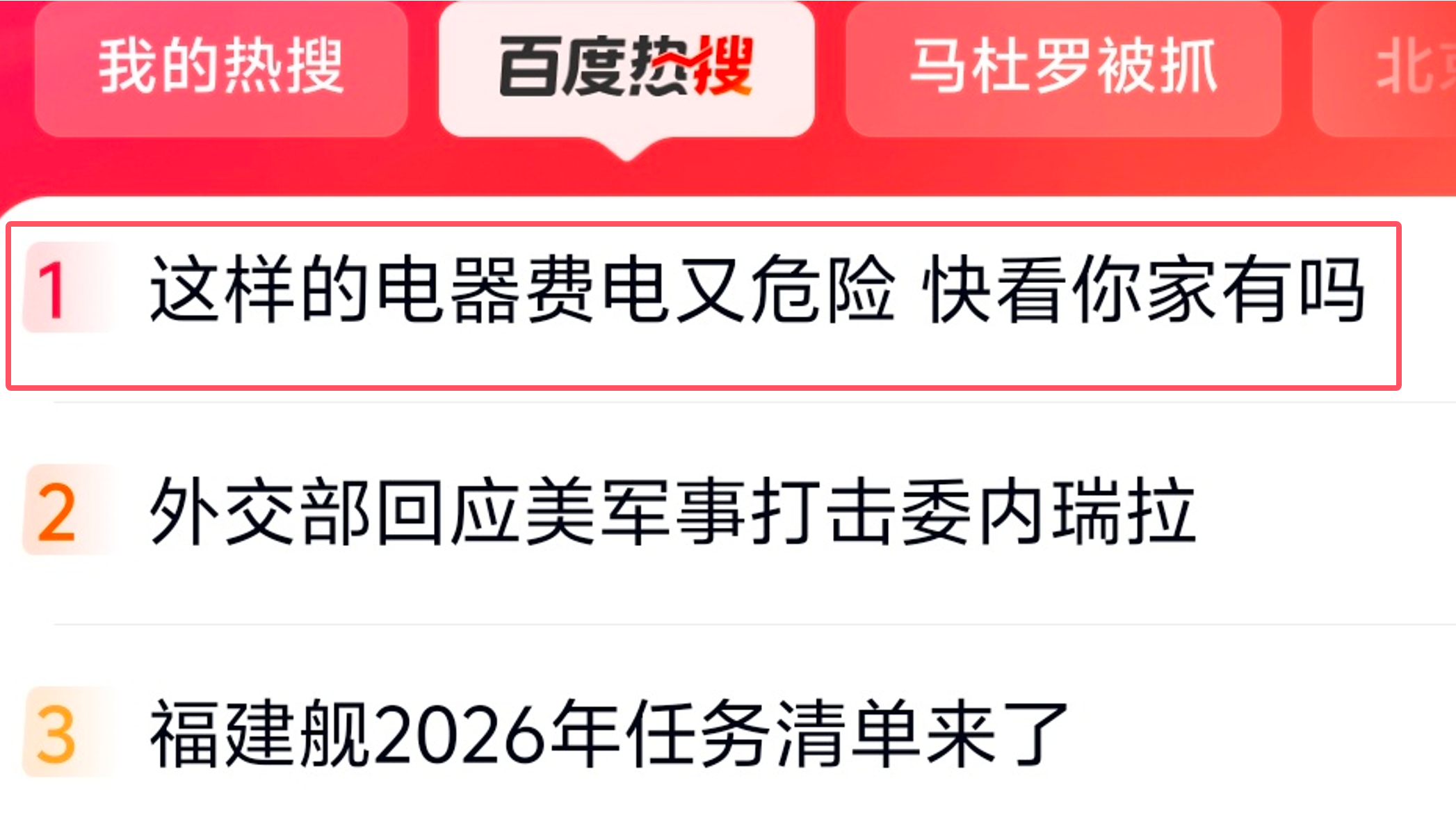 “這樣的電器費電又危險 快看你家有嗎”沖上百度熱搜頭條
