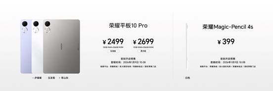 榮耀平板10 Pro于1月9日10:08全渠道正式開售,12GB+256GB標準版售價2499元、12GB+256GB柔光版售價2699元,全新手寫筆榮耀Magic-Pencil 4s售價399元;此次將所有配置都升級為新春禮盒套裝,12GB+256GB禮盒版現(xiàn)價2499元,12GB+256GB柔光禮盒版現(xiàn)價2699元,購買即贈榮耀Magic-Pencil 4s手寫筆。